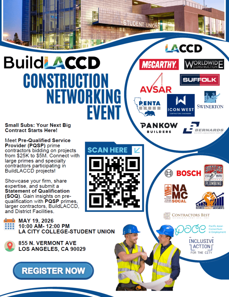 The Los Angeles Community College District’s (LACCD) Small Contractor Boot Camp is a four-session program explicitly designed for small contractors to improve their competitive bidding capacity. Through a comprehensive curriculum, small contractors will learn more about the pre-qualification process for the BuildLACCD Program’s Pre-Qualified Service Provider (PQSP) bench for projects ranging from $25K – $5M.